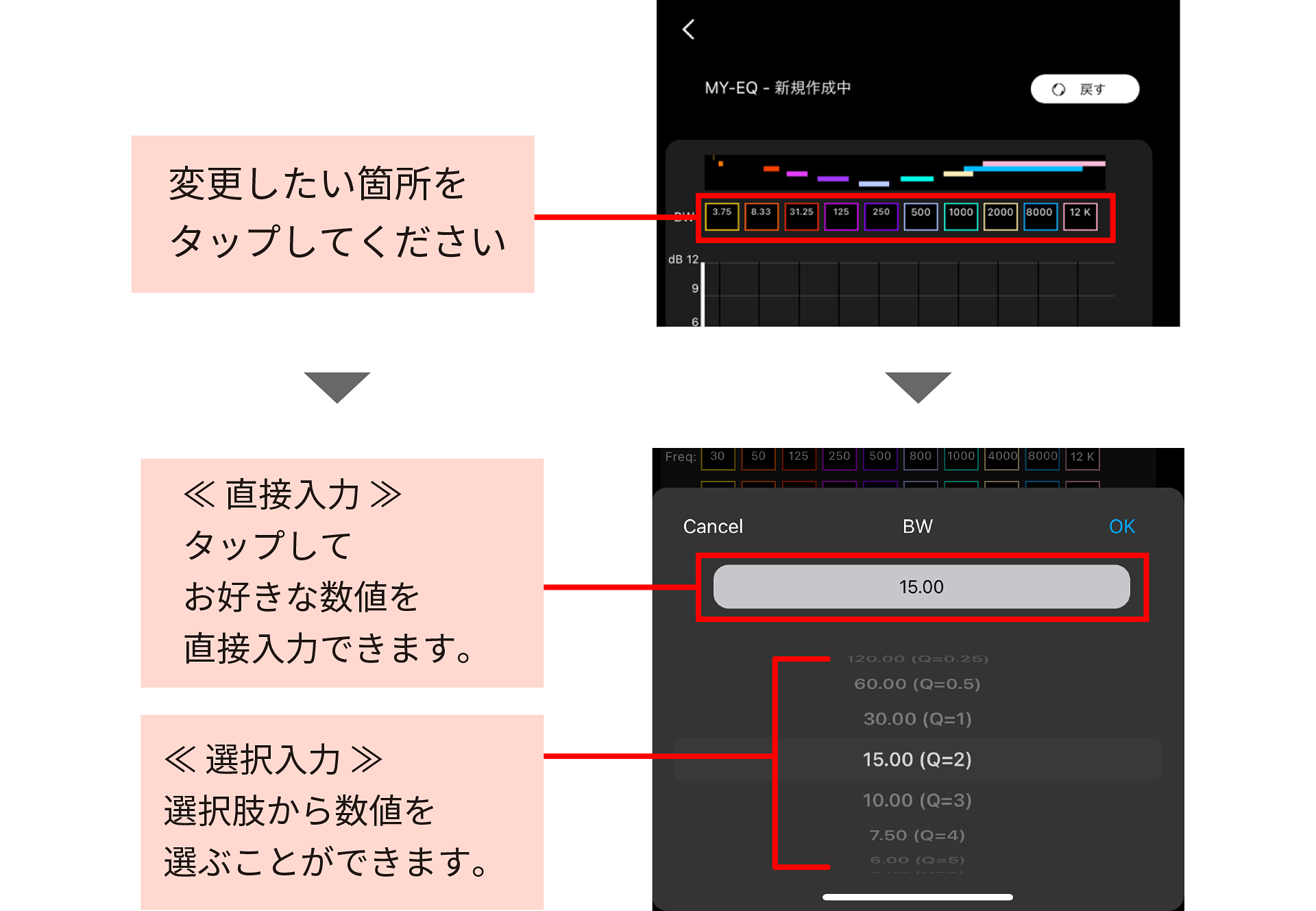 数値を操作したいBWのボックスをタップすると数値を変更する事ができます。