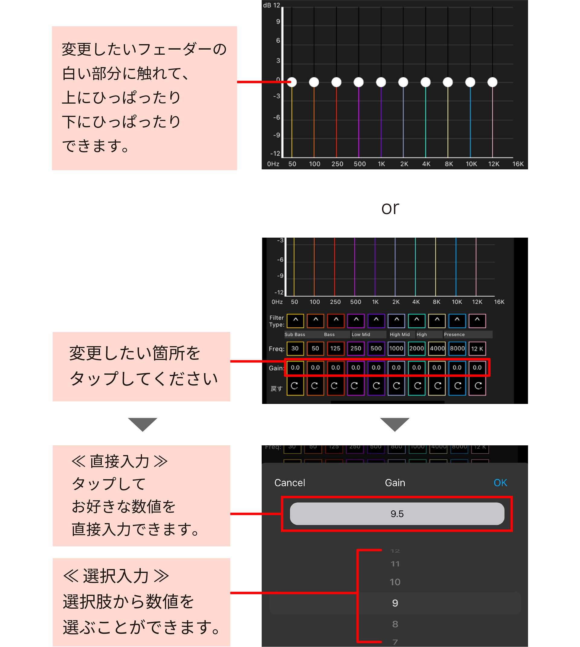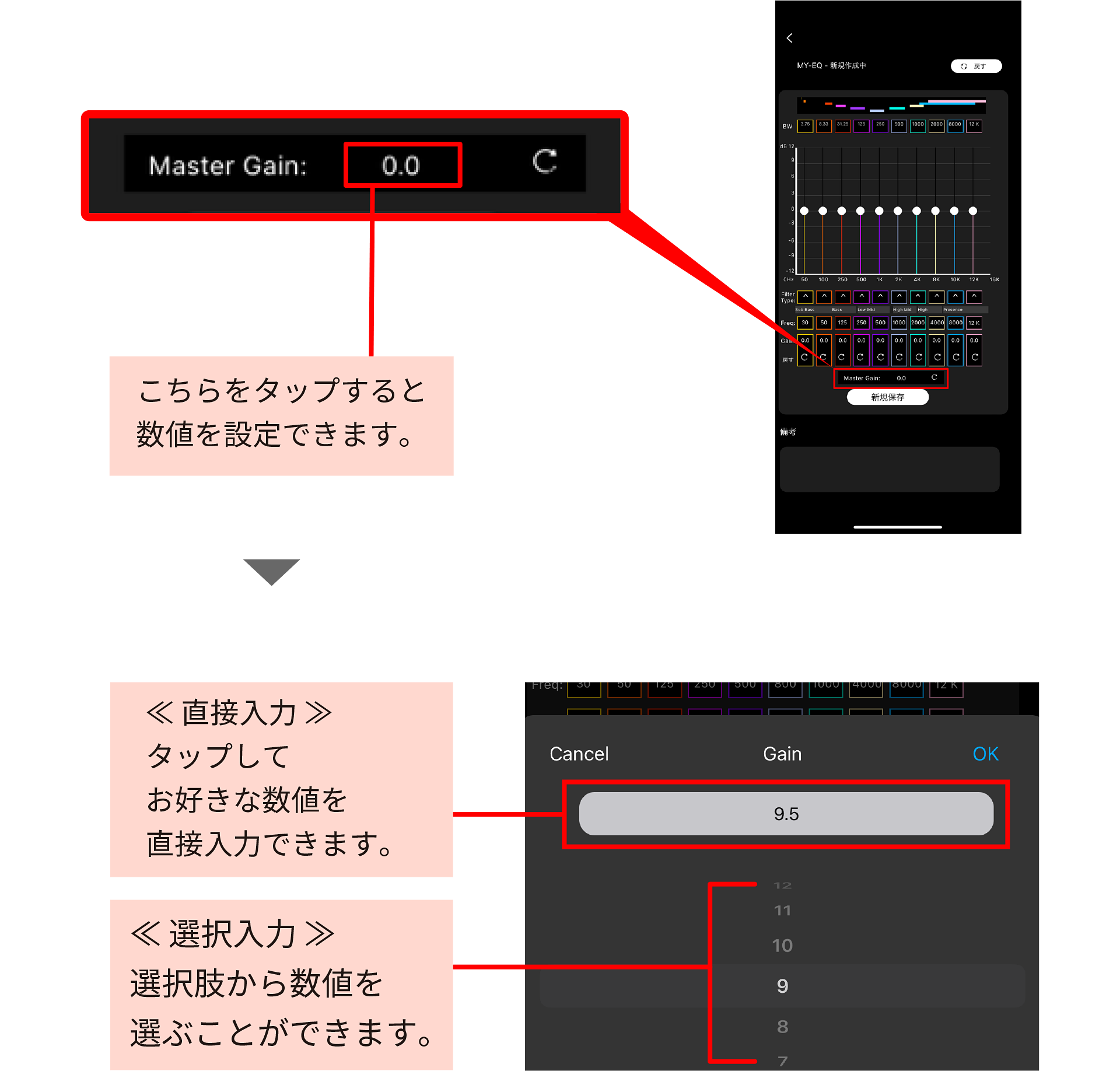 数値を操作したいGainのボックスをタップして数値の変更を行う事が可能です。
