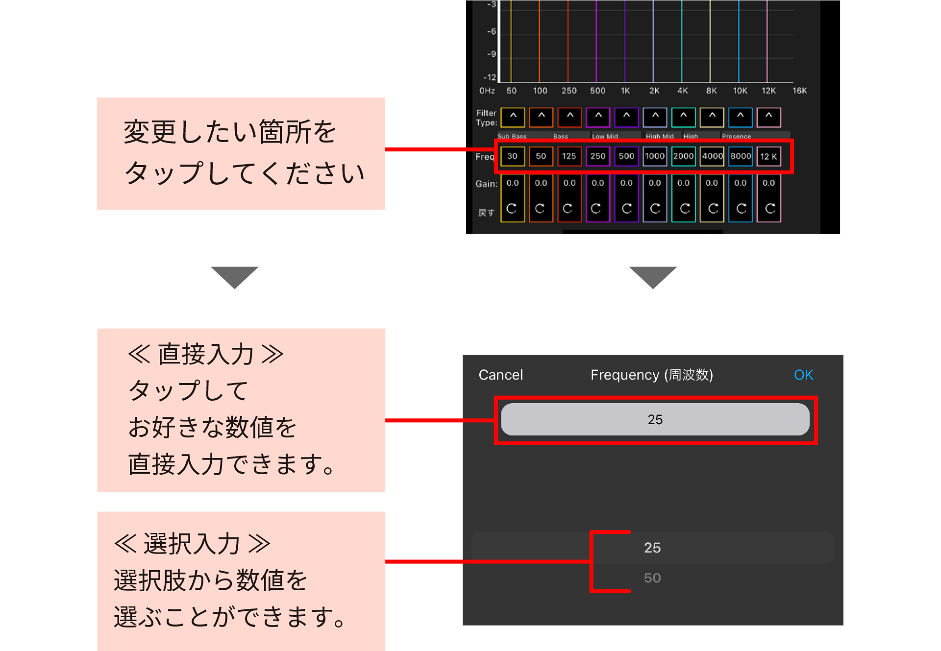 数値を操作したいFreqのボックスをタップすると数値を変更する事ができます。