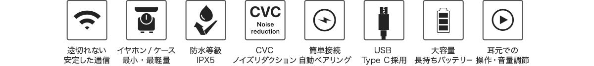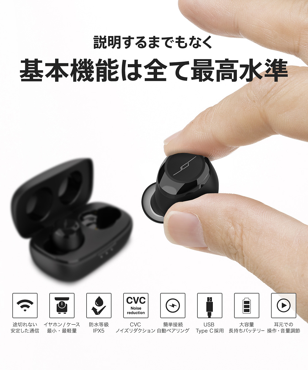 充電タイプ:USB type C採用、防水等級:IPX5、