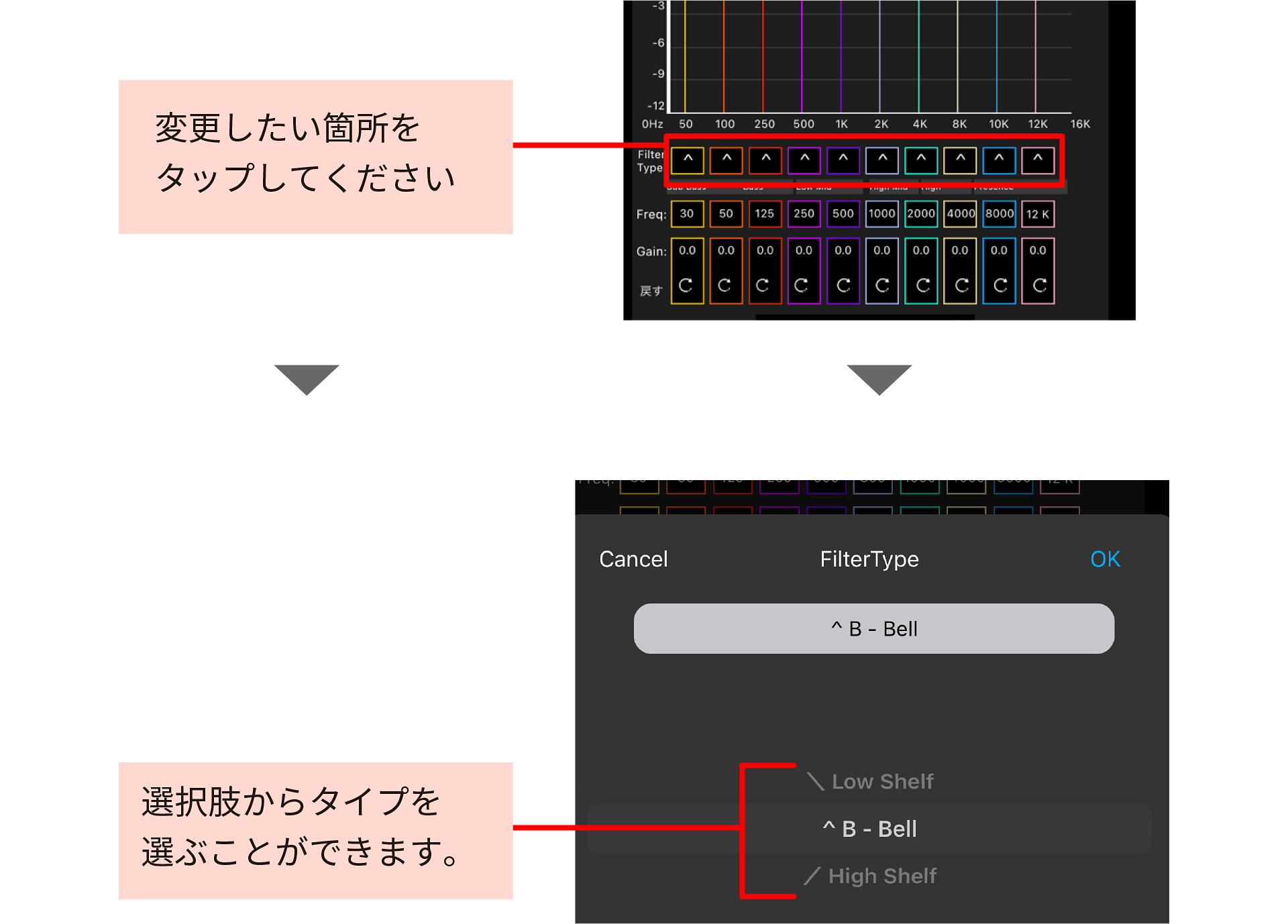 Fileter Typeは[ Low Shelf ][ Bell ][ High Shelf ]